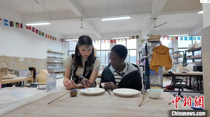 近日,景德鎮(zhèn)陶瓷大學(xué)烏干達(dá)籍留學(xué)生羅伯特(右)與來(lái)自江西中醫(yī)藥大學(xué)的哈薩克斯坦留學(xué)生博塔(左)一起在瓷盤(pán)上作畫(huà)。(受訪者供圖)