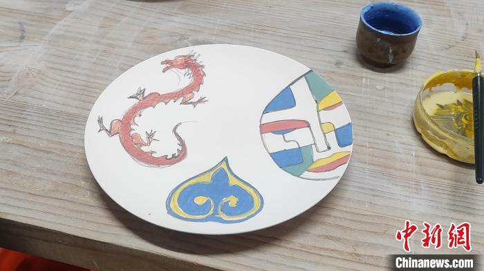 近日,烏干達(dá)籍留學(xué)生羅伯特與哈薩克斯坦留學(xué)生博塔一起創(chuàng)作的瓷盤(pán)融合三個(gè)國(guó)家的文化元素。(受訪者供圖)